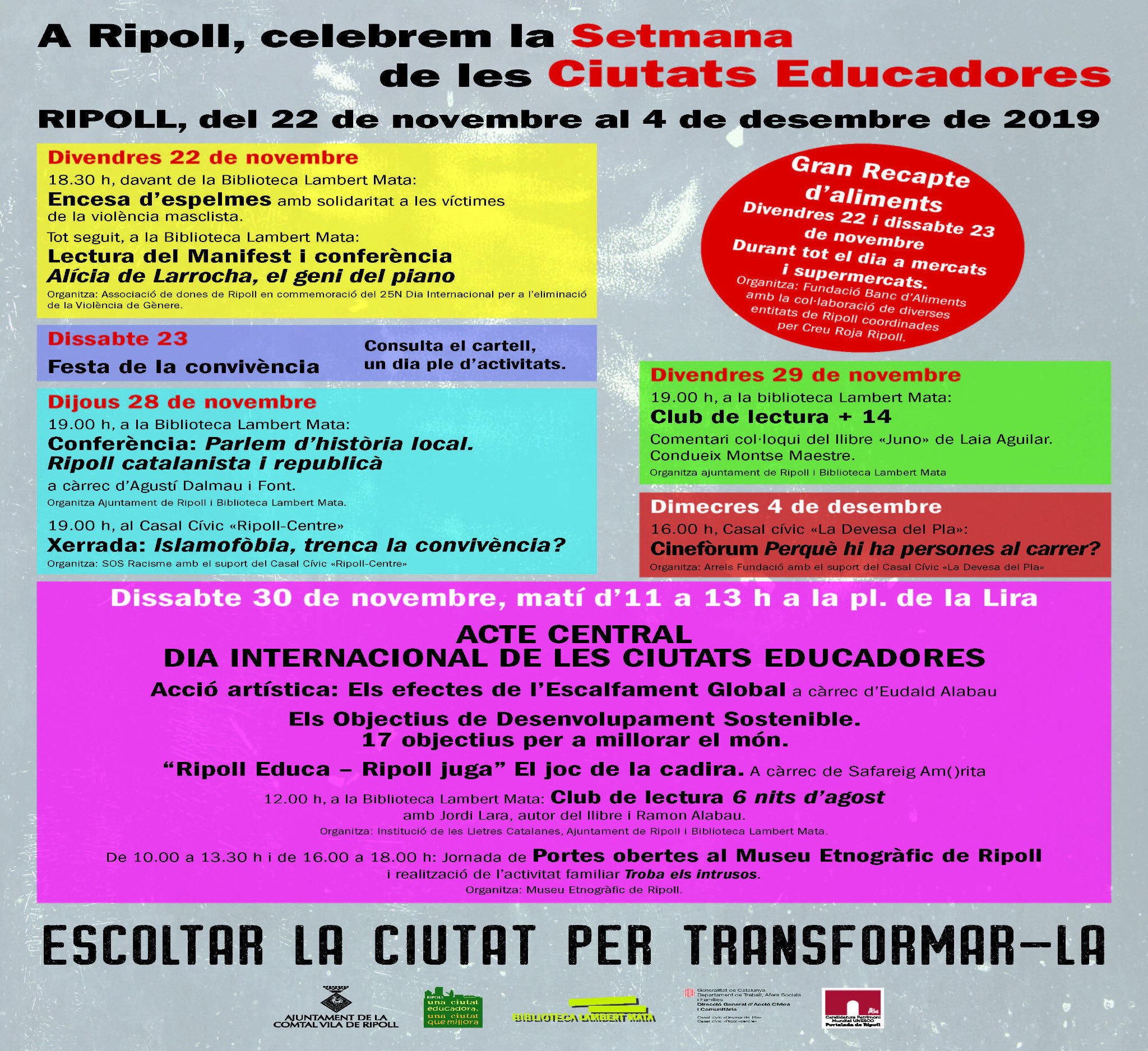 - 26/11: acte central - lectura del manifest i ponència 'Parlem de la participació comunitària i educativa', a càrrec de Lluís Carol.