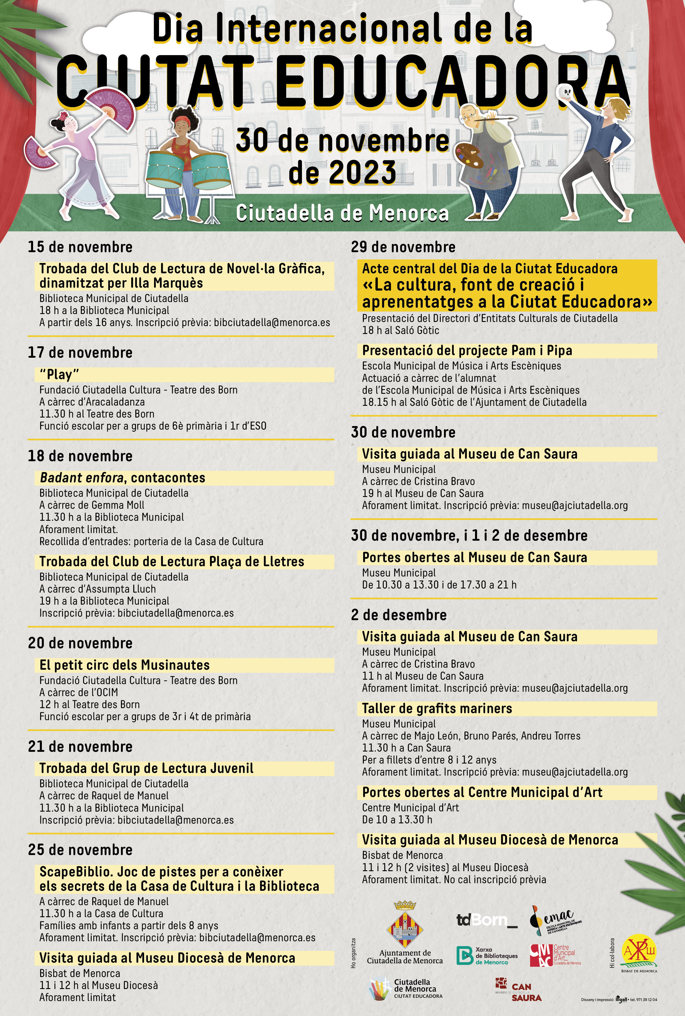 Celebració Dia Internacional Ciutat educadora- Jornada de cultura i educació: una jornada d'un dia on posarem en relació equipaments culturals, professionals de l'educació, projectes i programes per a connectar, compartir coneixement i generar-ne de nou. Amb la benvinguda del Regidor d'educació i del Regidor de Cultura. Una taula inspiradora de diferents professional, Teatre social i reflexions des de la Cultura i l'educació des de la mirada d el' ètica, per la Dra Begoña Roman*.