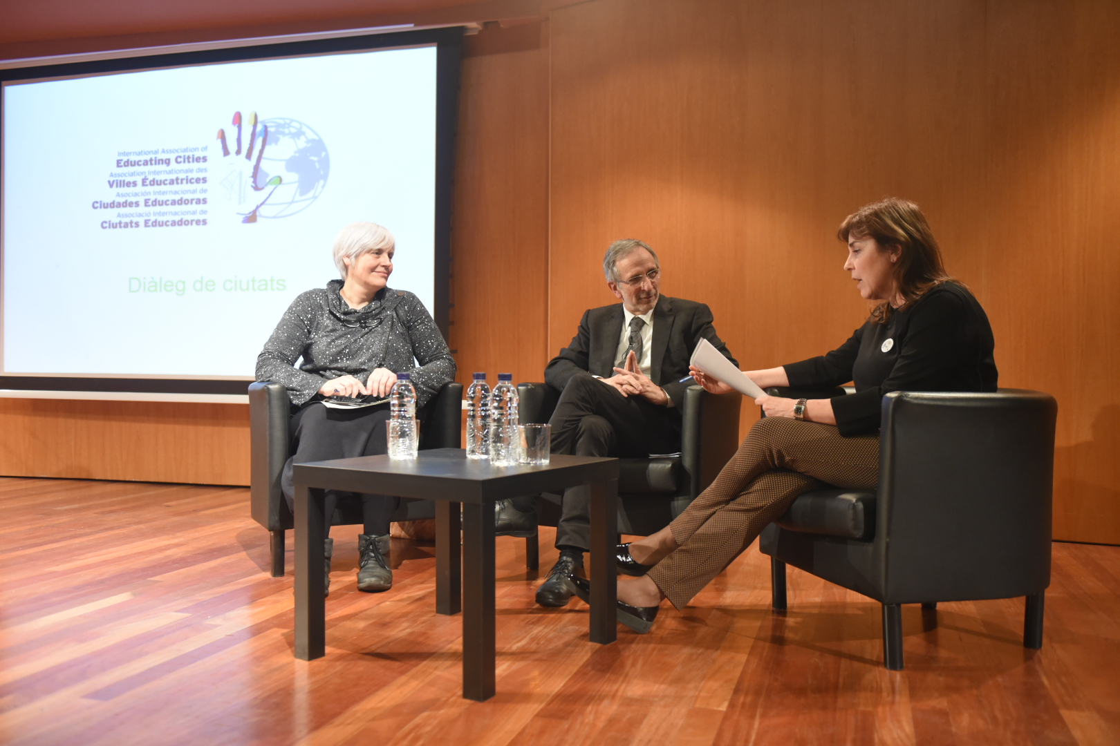 Later, the Granollers Auditorium Theater hosted a dialogue on “The collective transformation of cities” between the Mayor of Granollers, Mr Josep Mayoral, and UCLG Deputy Secretary General, Ms Emilia Saiz, moderated by Jordi Collet, professor of Sociology of Education of the University of Vic.