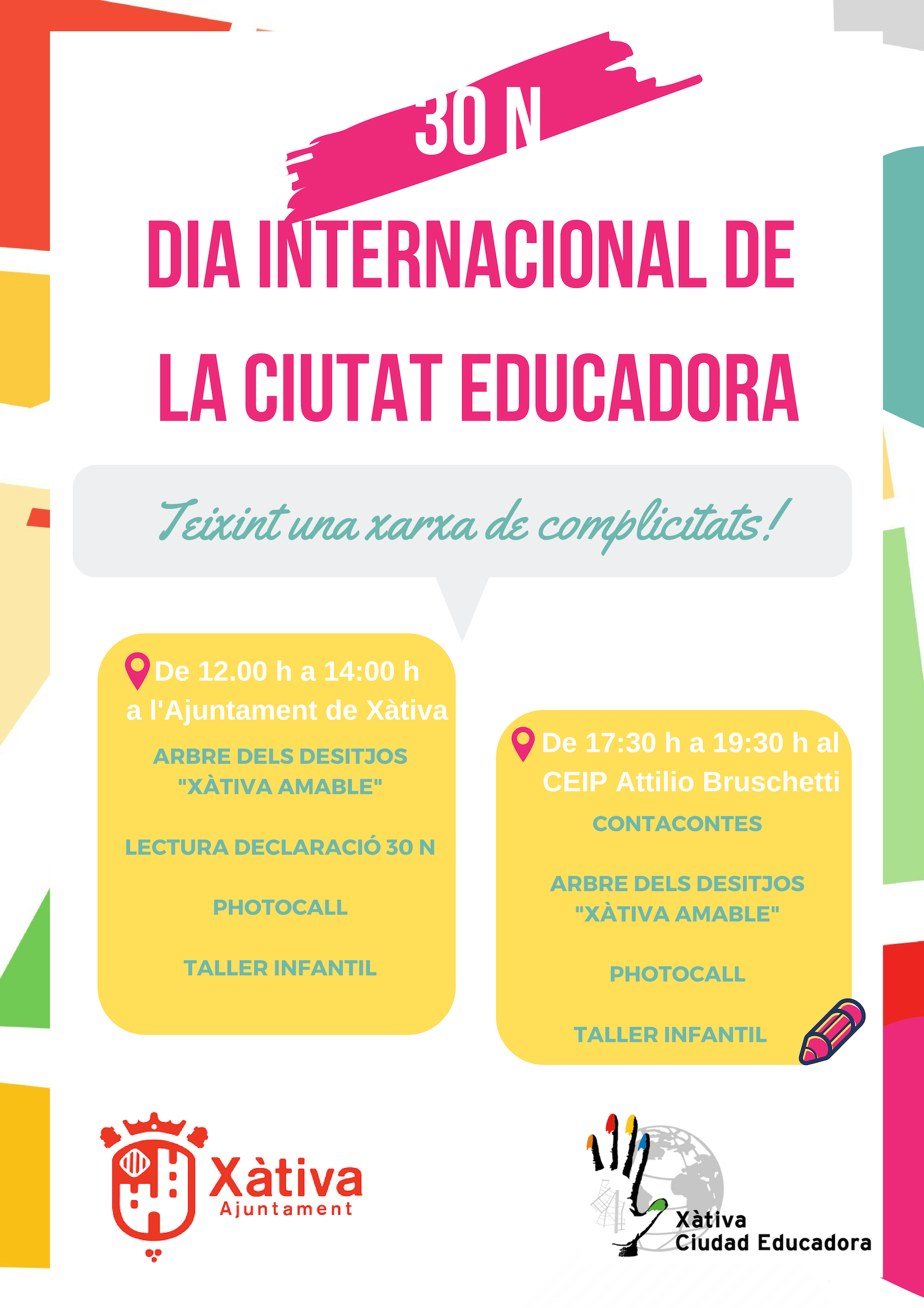 • Día 29: Taller de circo, Taller de teatro, Tu modelo de ciudad, Espacio de movimiento, Espacio de construcción, Taller de pan, Ciudad educadora y chapas reflexivas, Taller primeros auxilios, Teatro Infantil, Juegos tradicionales con colectivo de personas mayores del proyecto Ciudad Amigable.